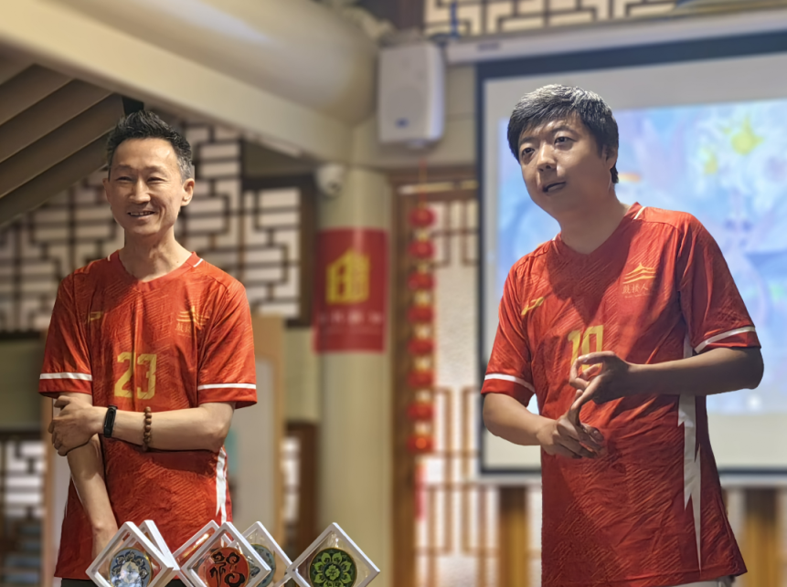 “今天首映礼的主人公马超可是一位能文能武的北京孩子,大家看我俩穿的这身行头就能看出来,我俩是一个足球队的——鼓楼人艺足球队。马超老师是手艺人里踢球最好的,在足球运动员里做掐丝珐琅最好的……”方喆开场后,马超讲述了自己投身掐丝珐琅的经历和制作的乐趣。