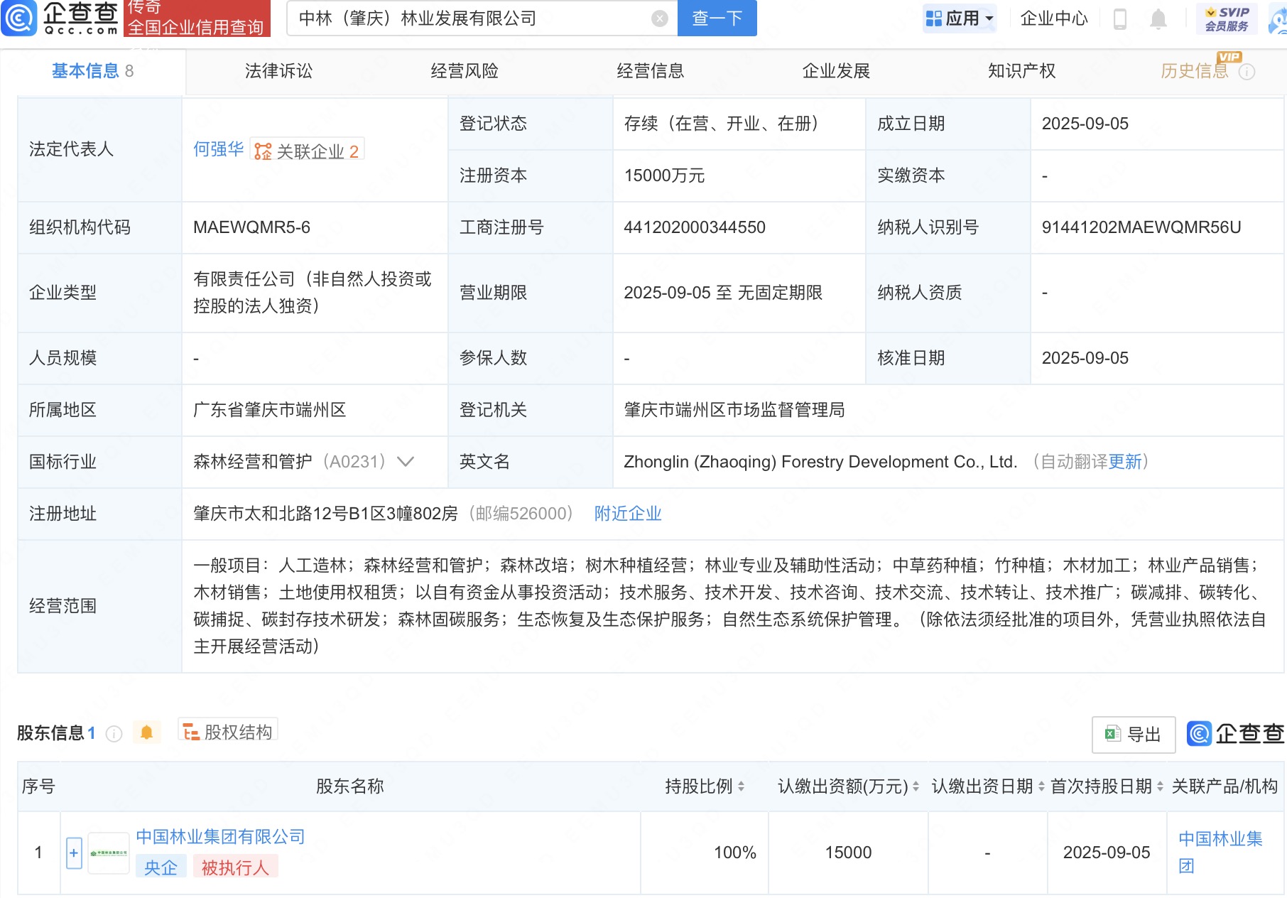 近日武汉股票配资开户,中林(肇庆)林业发展有限公司成立,法定代表人为何强华,注册资本1.5亿人民币,经营范围含人工造林,森林经营和管护,森林改培,树木种植经营等。企查查股权穿透显示,该公司由中国林业集团有限公司全资持股。